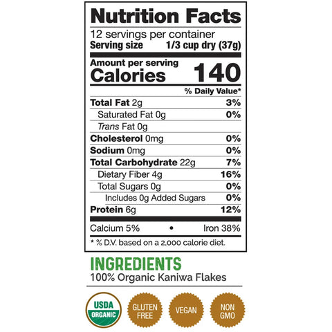 - Cañihua en hojuelas premium: Vegana, certificación orgánica por la USDA, libre de gluten, sin GMO.